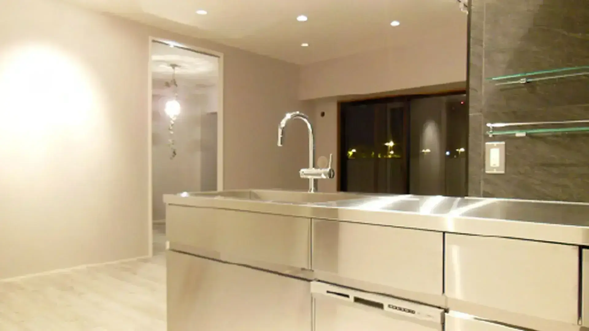 空間全体に石やガラスなどを使用し、色柄はシックにモノトーンやダークブラウン、キッチン・洗面台などは家具調のラグジュアリーなものを採用。小物やアクセサリー類の詳細に至るまで輸入物やメッキ・真鍮など存在感のある商品を選定します。