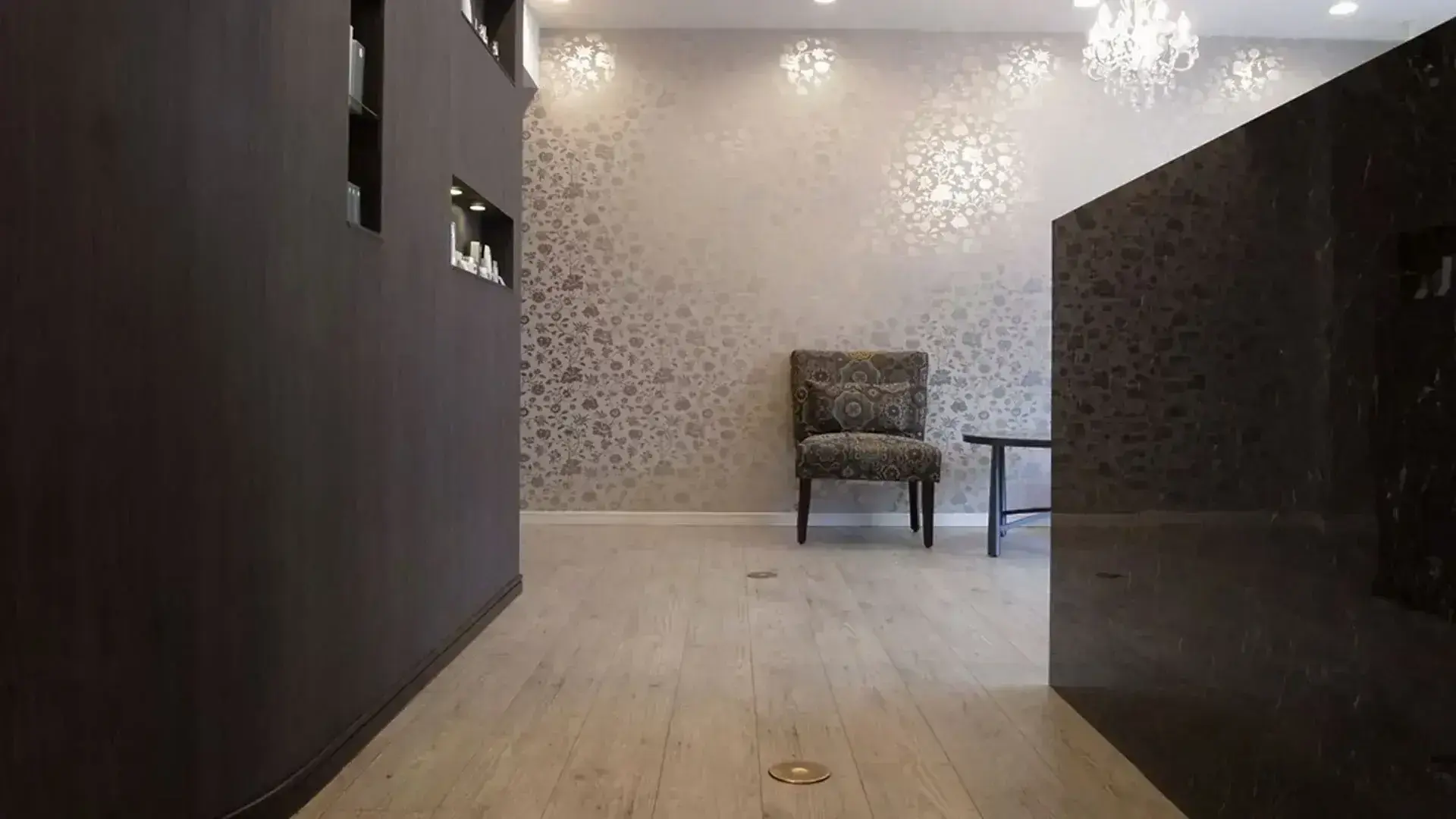 空間全体に石やガラスなどを使用し、色柄はシックにモ