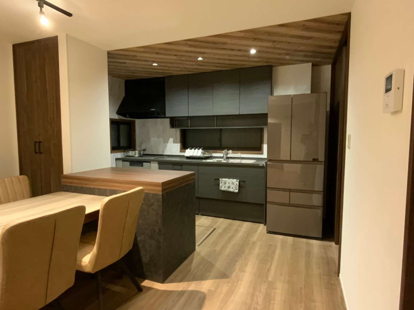 囲われたKitchenを対面化、収納や冷蔵庫・ゴミ箱等は、天井高いっぱいのハイドアの造作建具で...