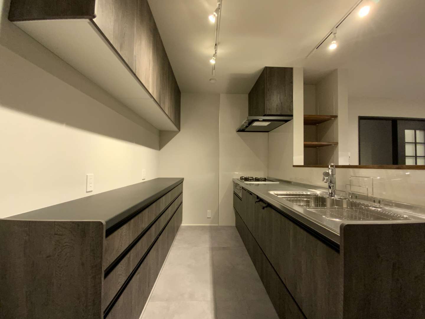 オートドックスが形のペーシュ型と対面にカップボードの形になります。ペシャ型のキッチンに笠木を上げてキッチンの手元が隠せるようになっています。リビング側からはスッキリ隠すことができます。