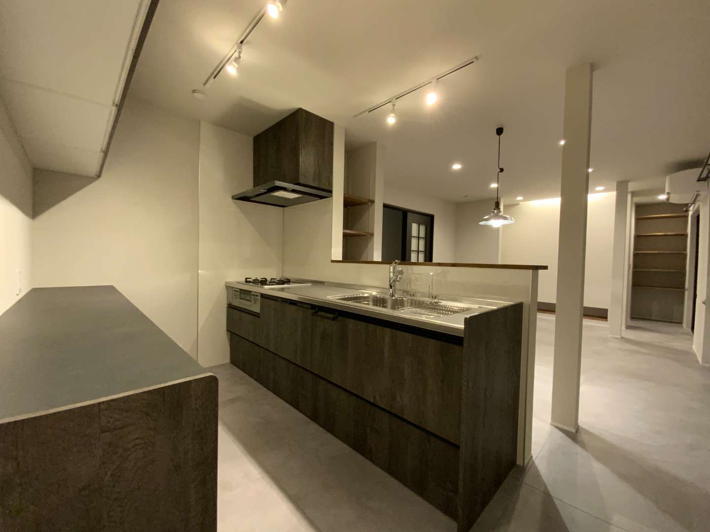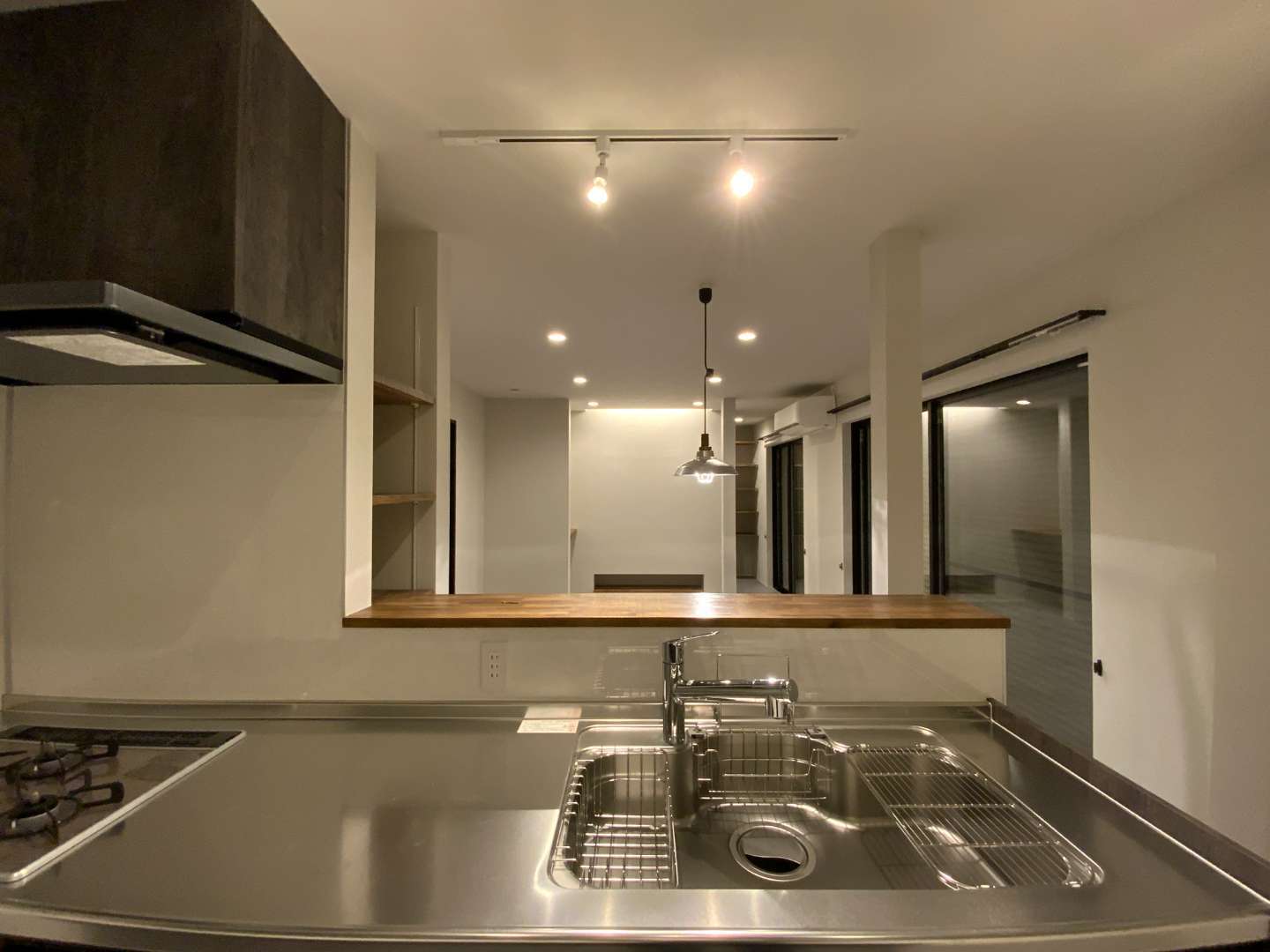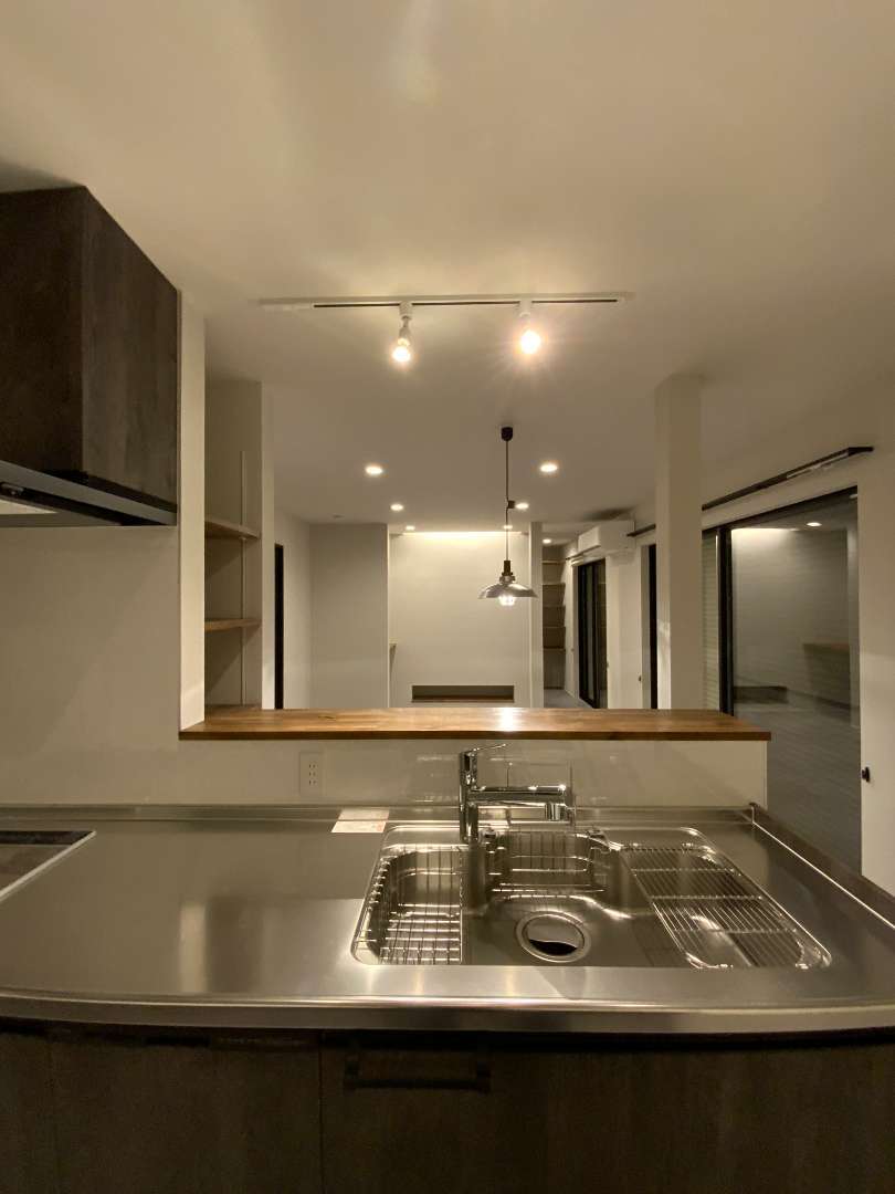 キッチンから見たリビングは照明器具がアクセサリーとしてアクセントになっています。