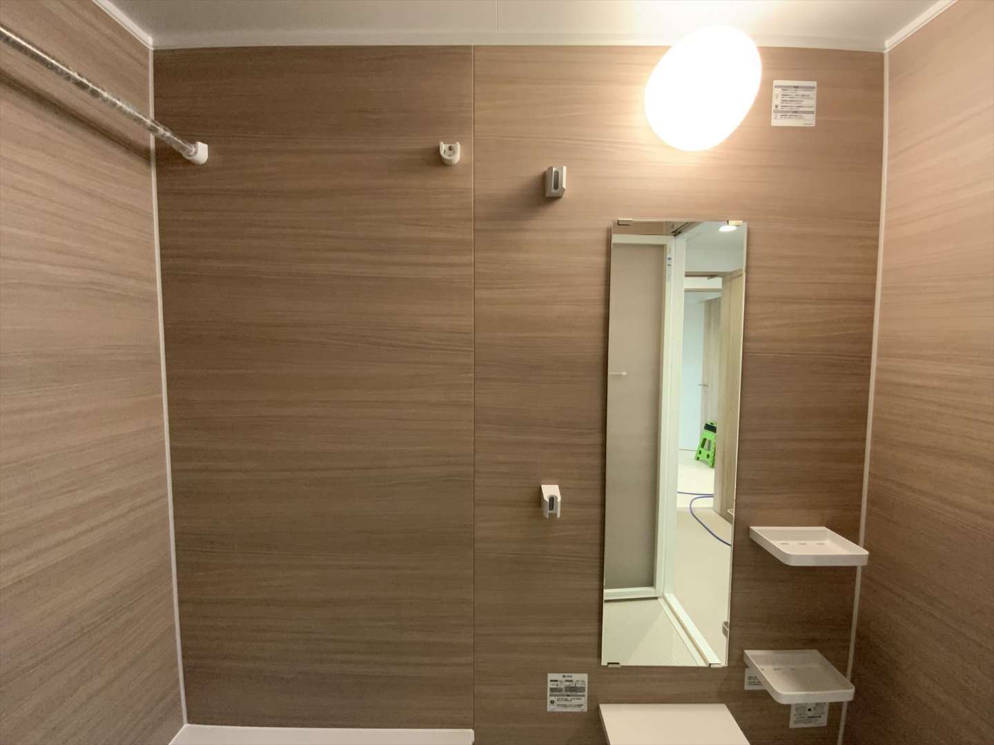 浴室へ繋がるランドリールームの左側に、リネン庫のワイド2300の可動棚を床からフロートさせ、壁...