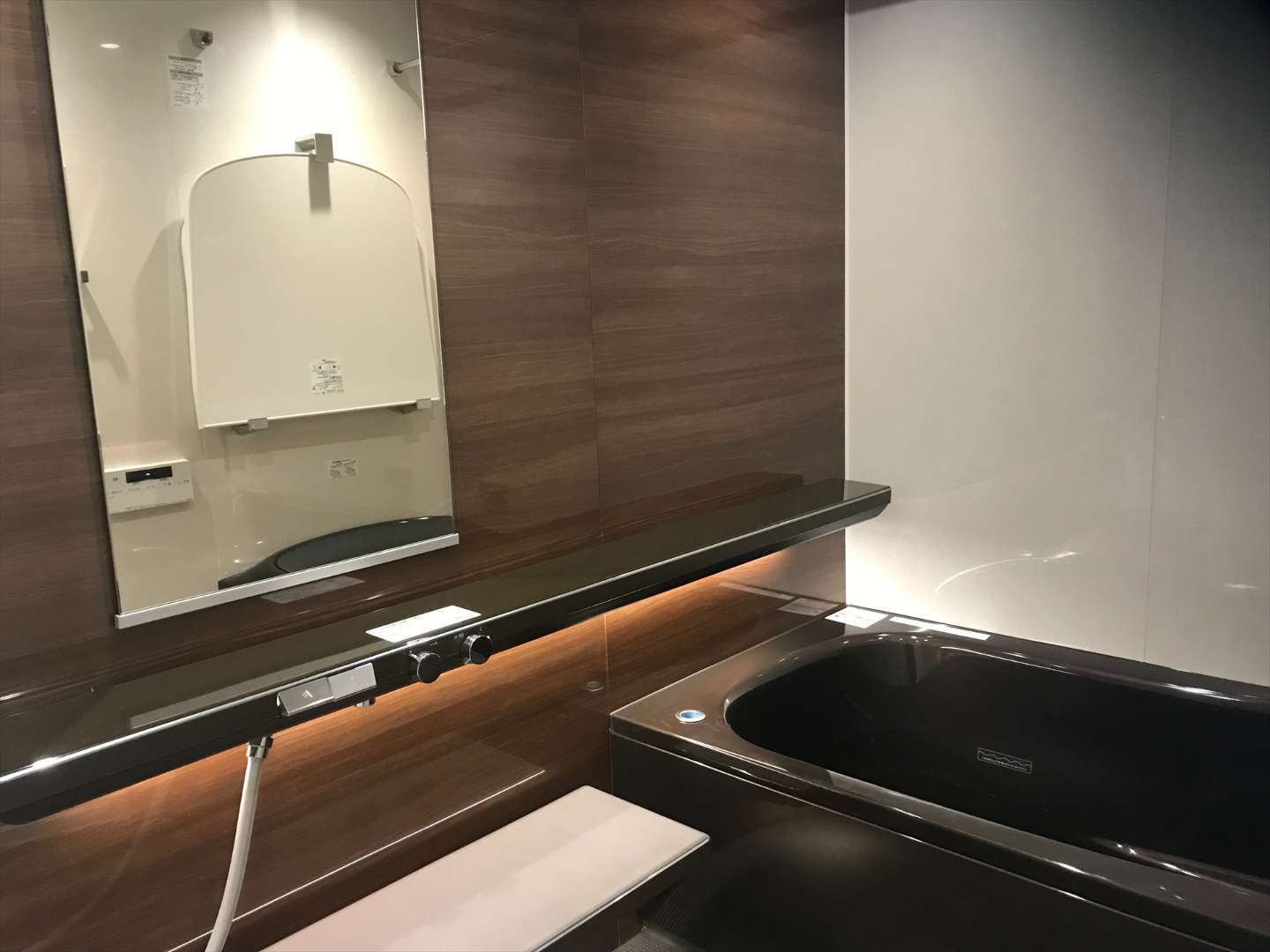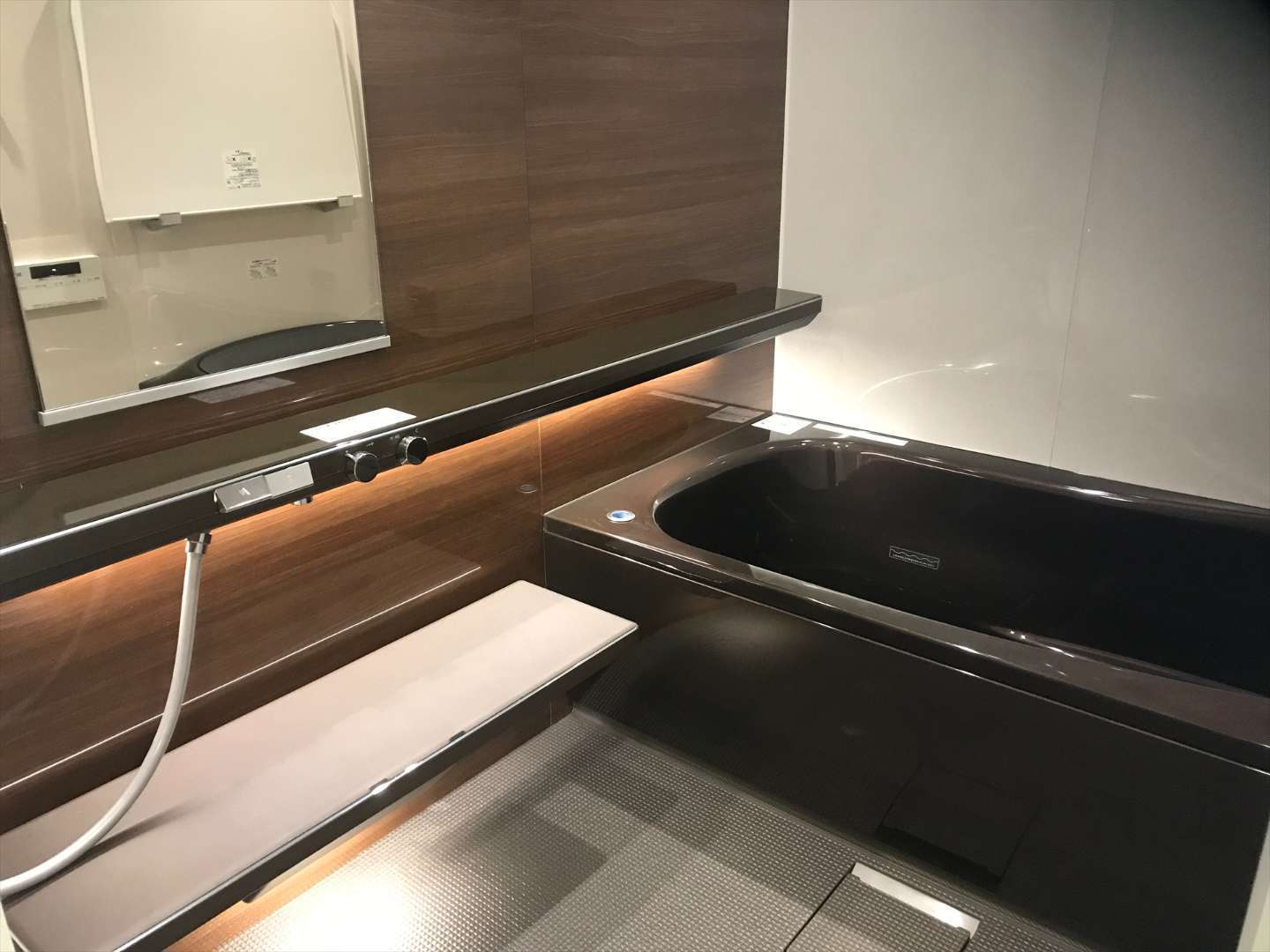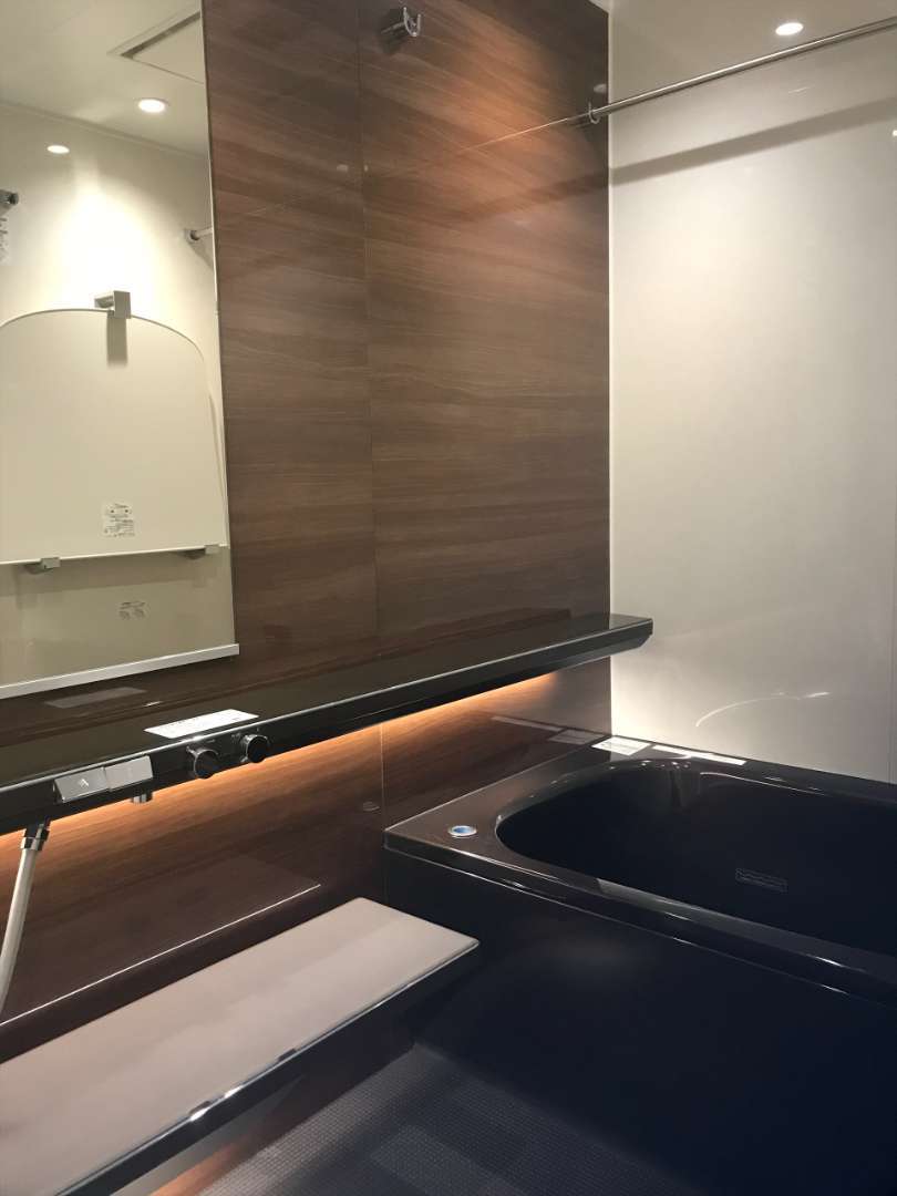 アクセントカウンター(照明付き)でホテルのような浴室になりました。床もブラウンのパール調をお選びいただきました。