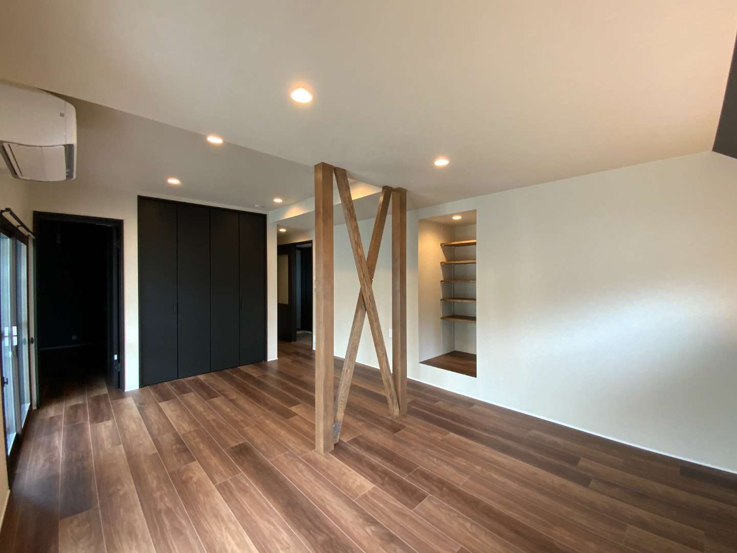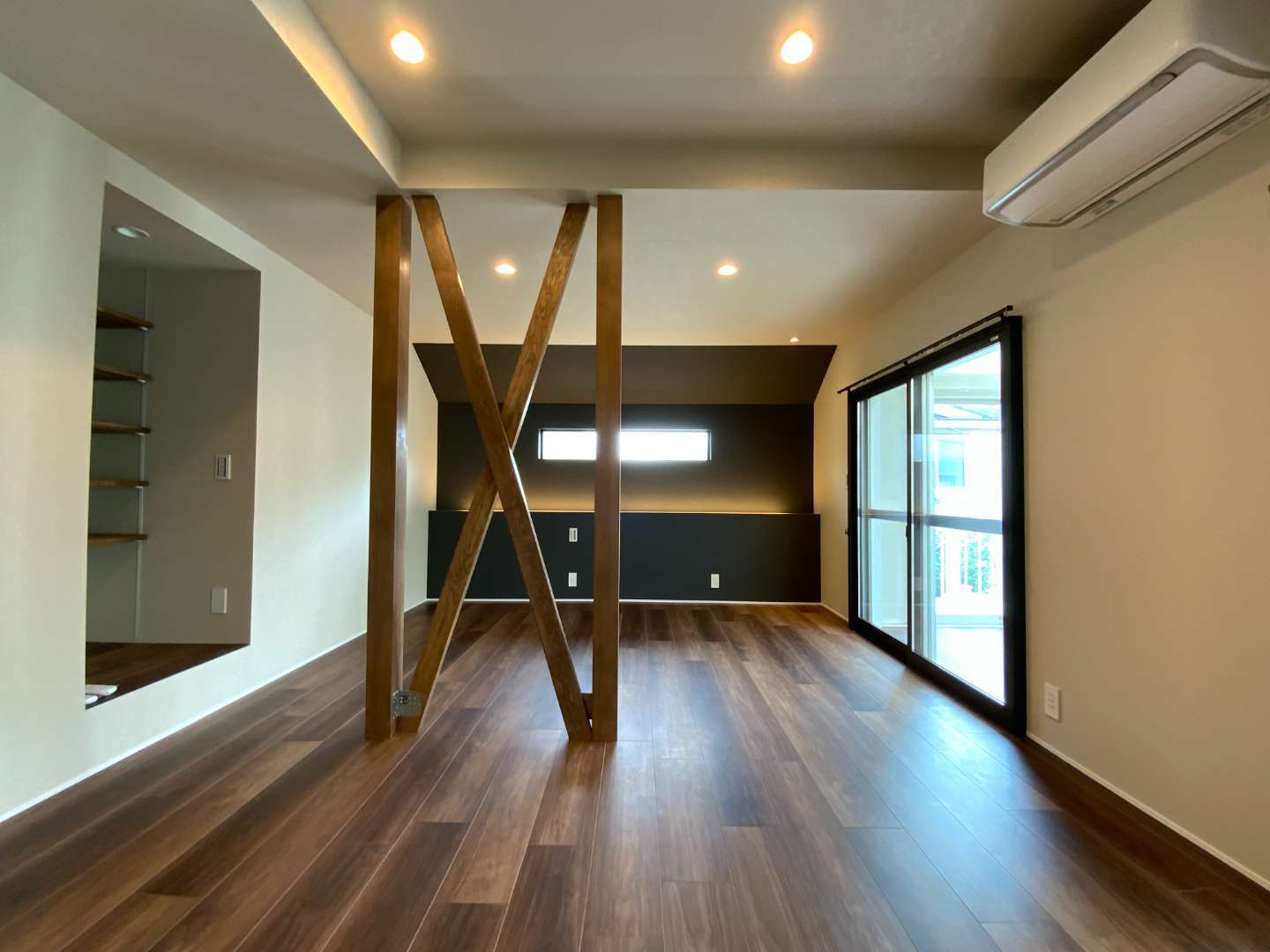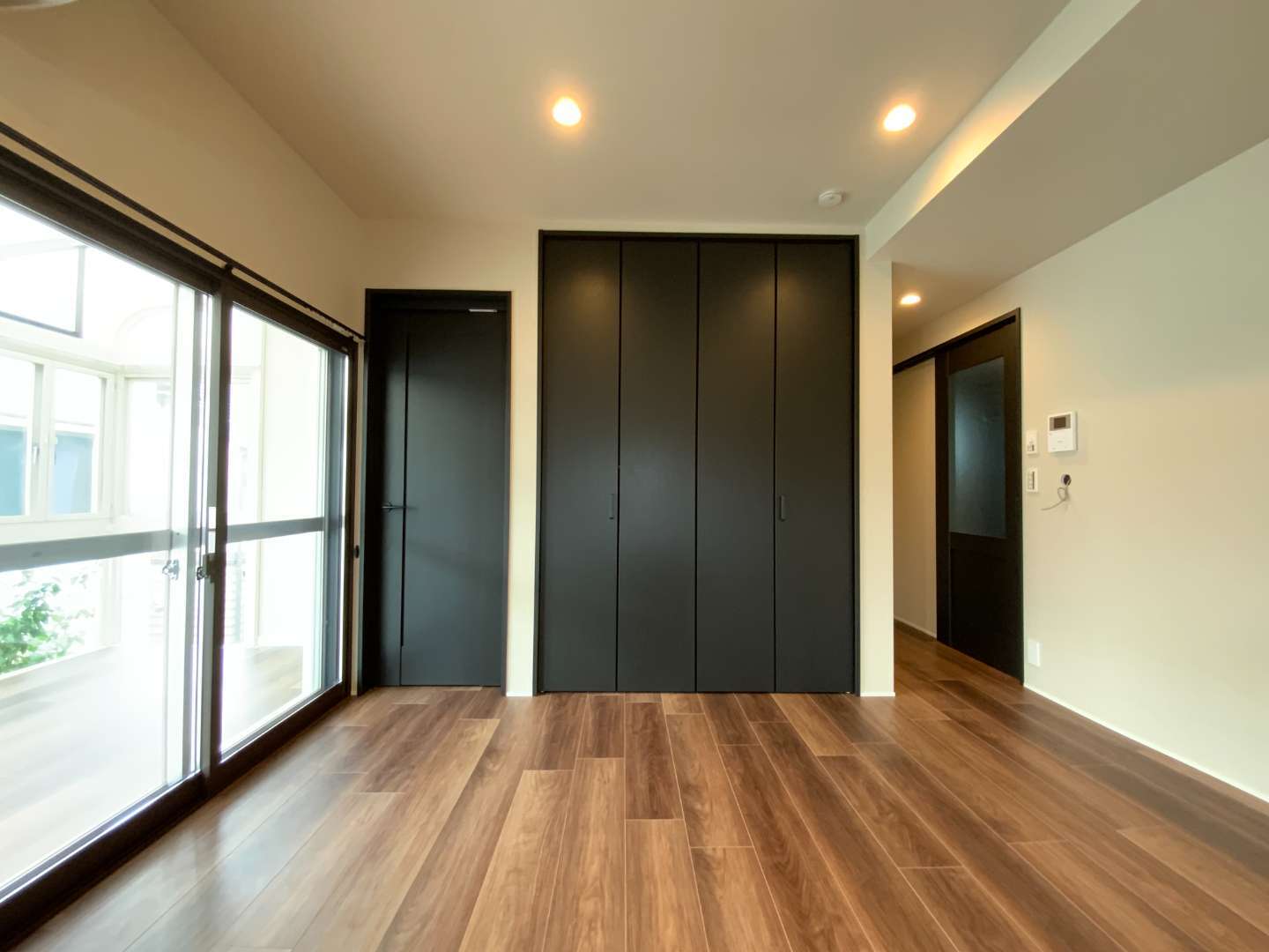 クロスや建具の色に黒を取り入れることで、木目調の優しい雰囲気の中にも大人さを醸し出しています。