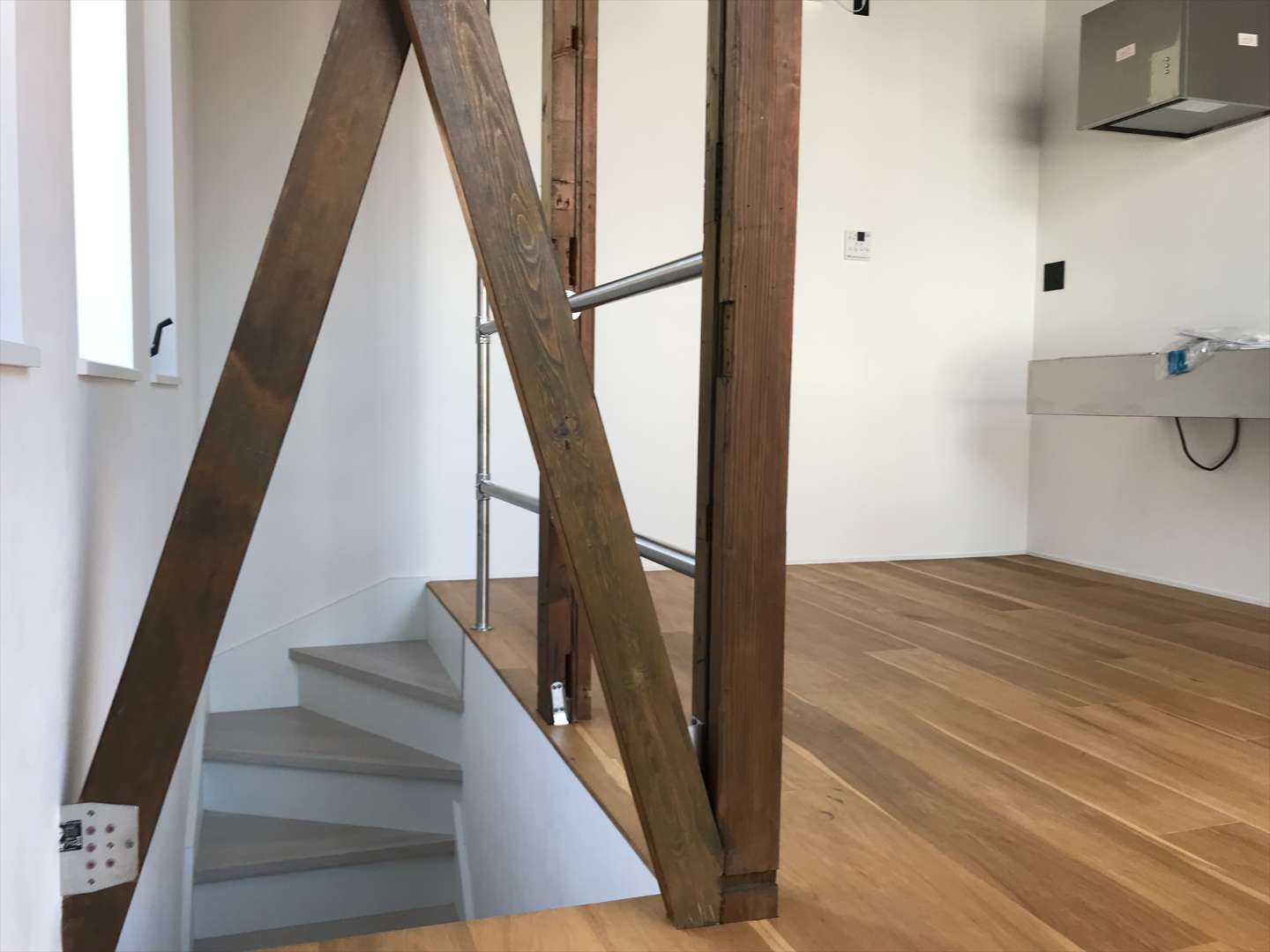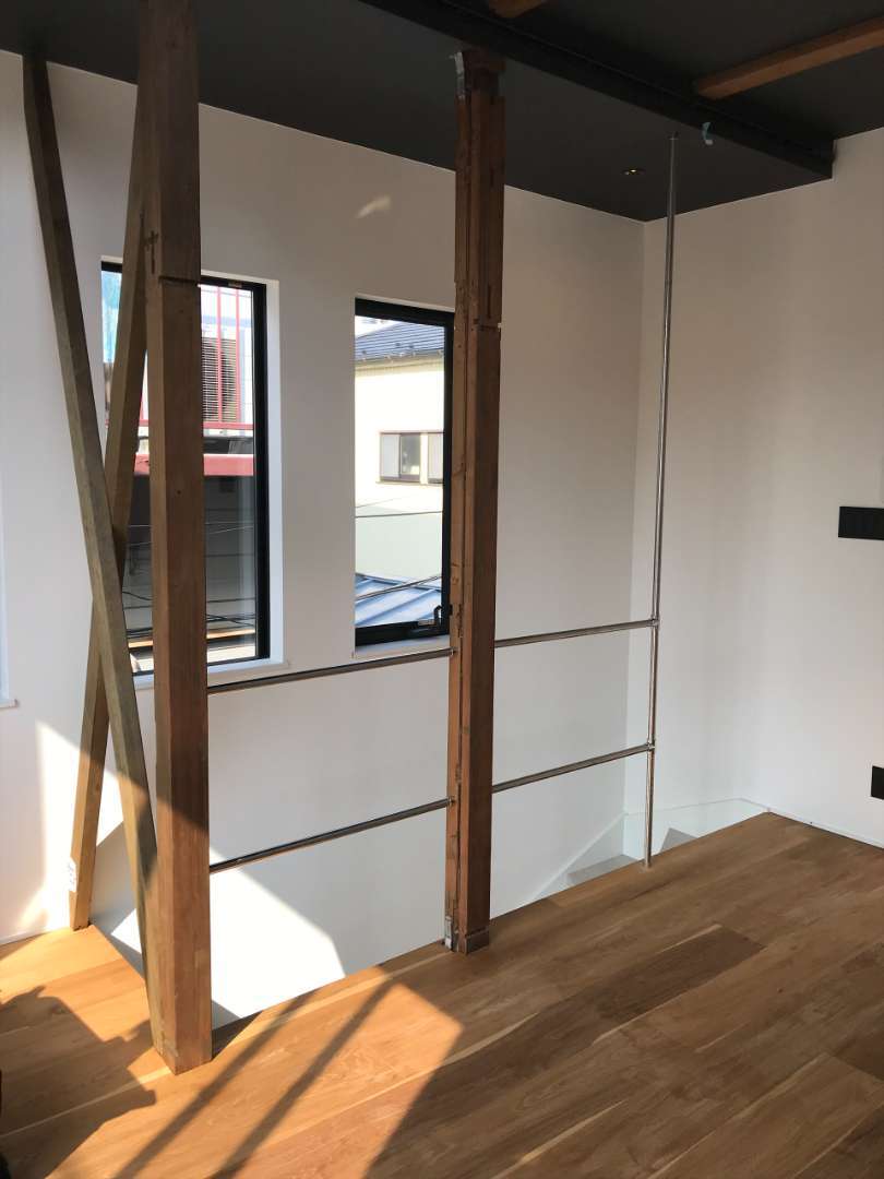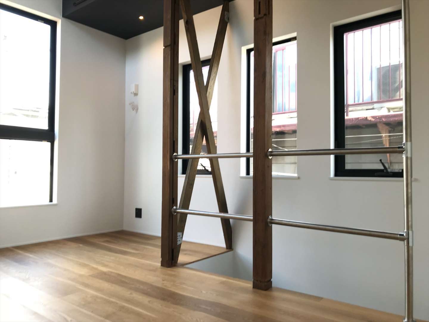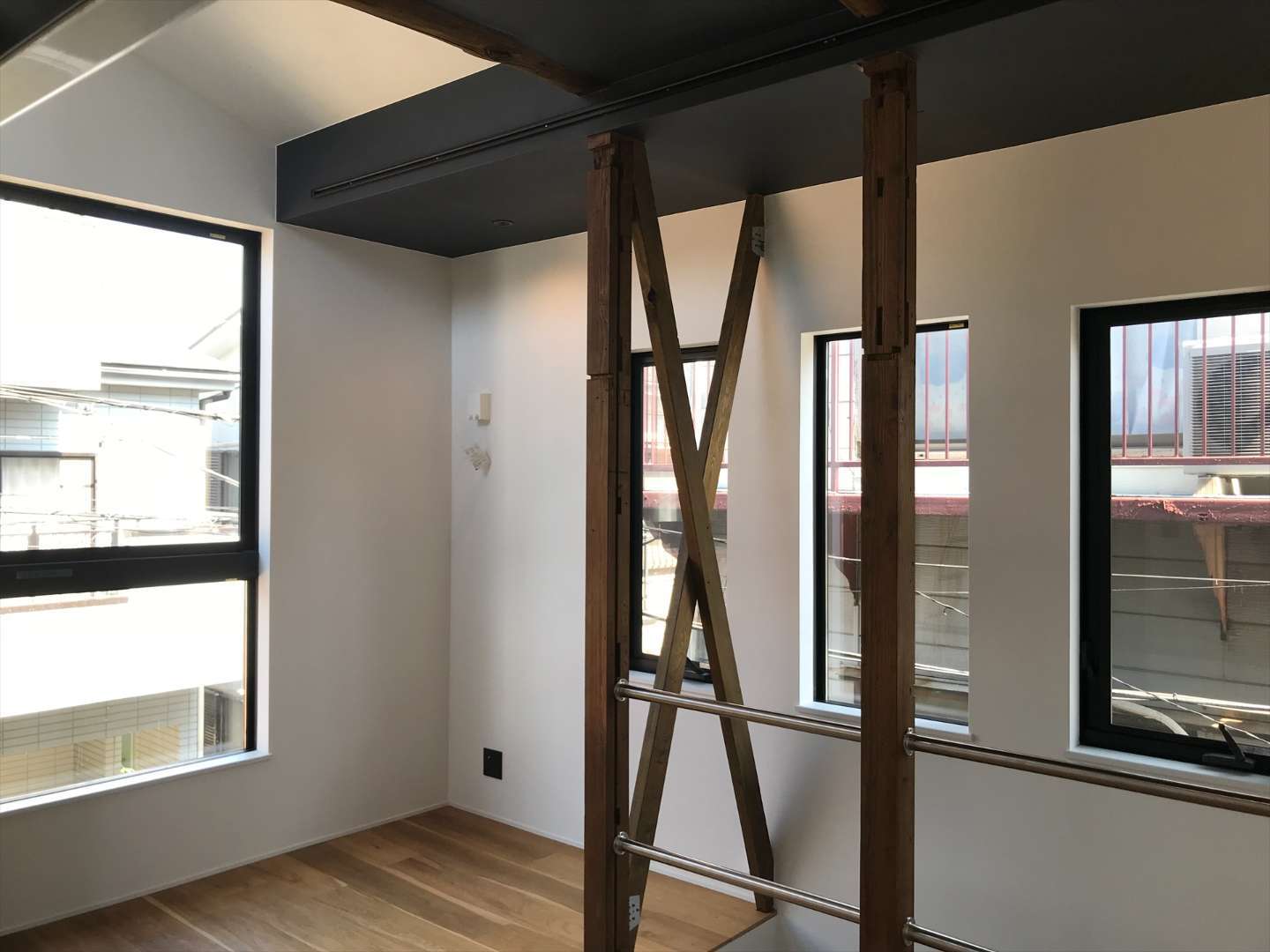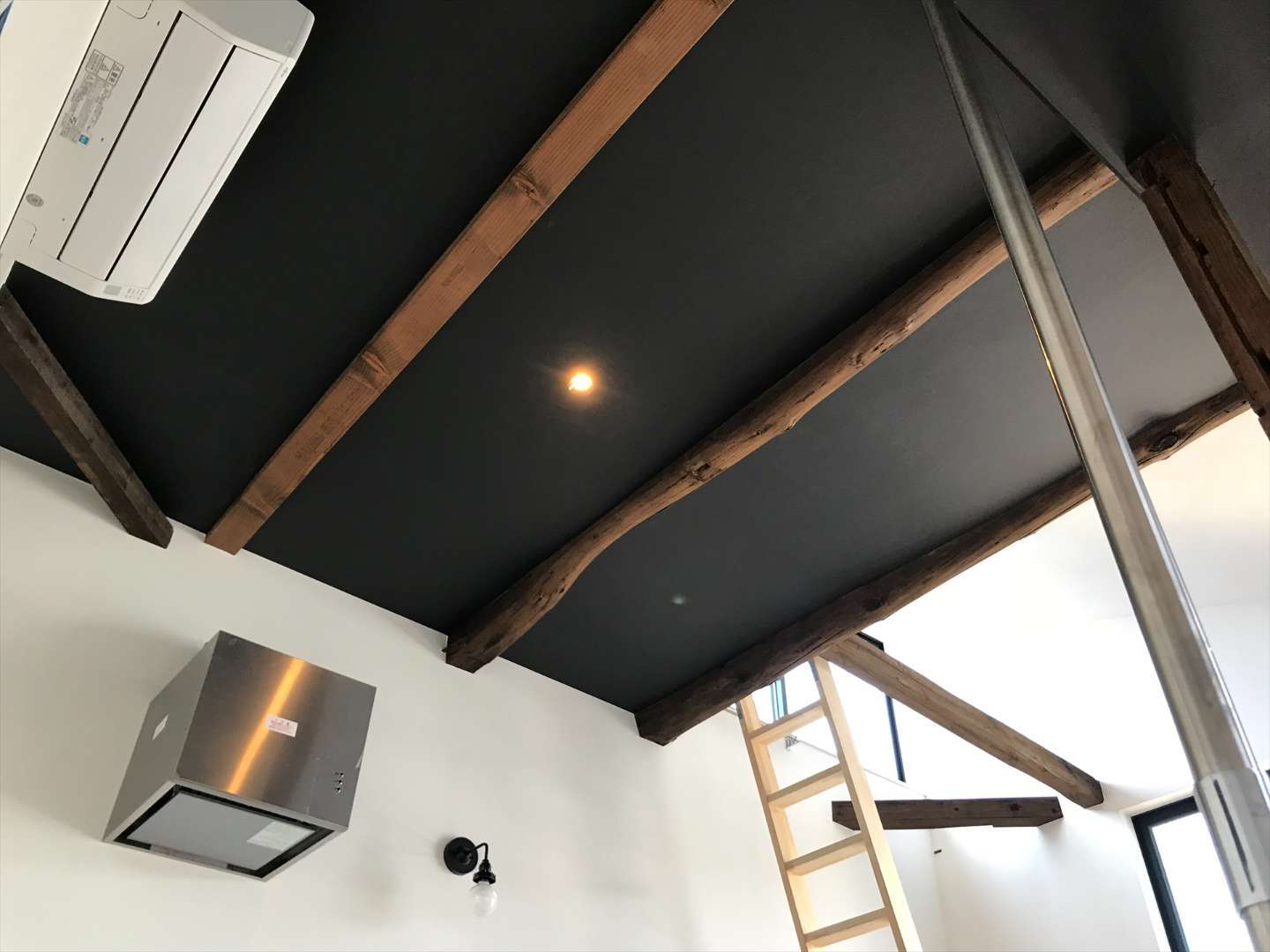 耐震工事を兼ねた柱の筋交い、梁、母屋束などの木部を露出する事で、素材感を出しました。