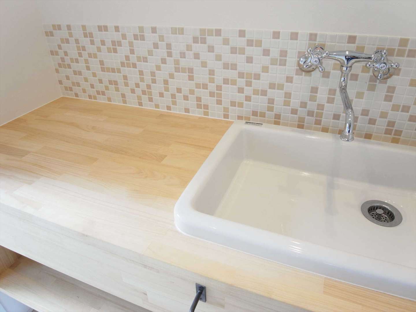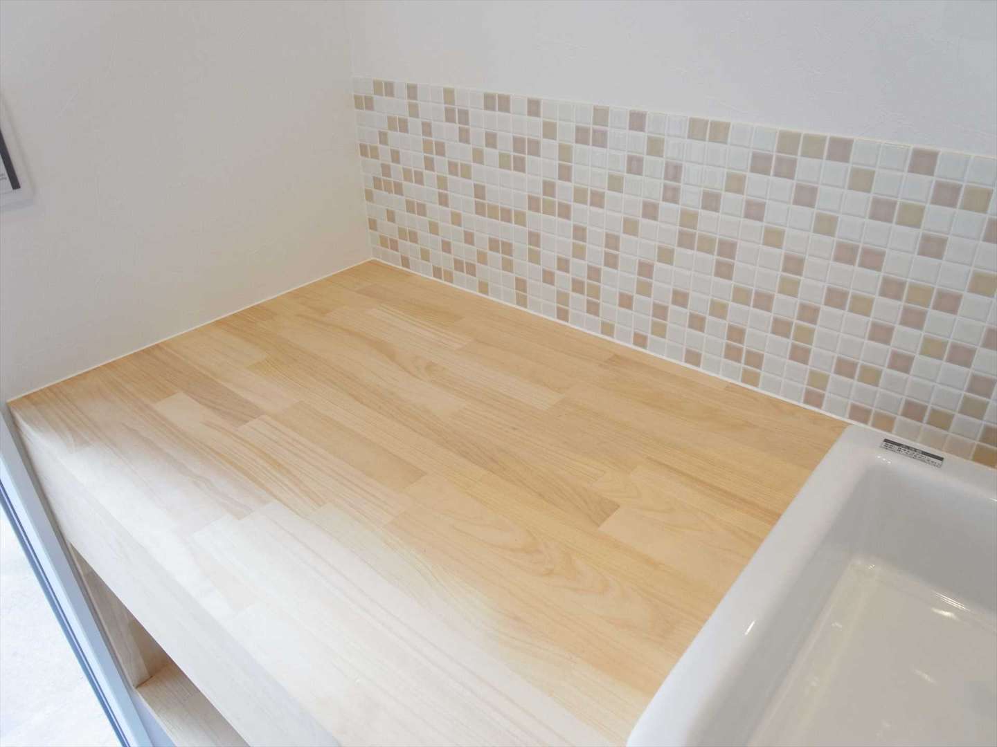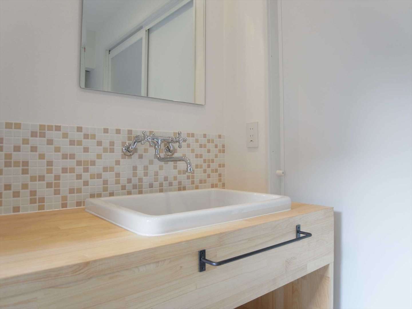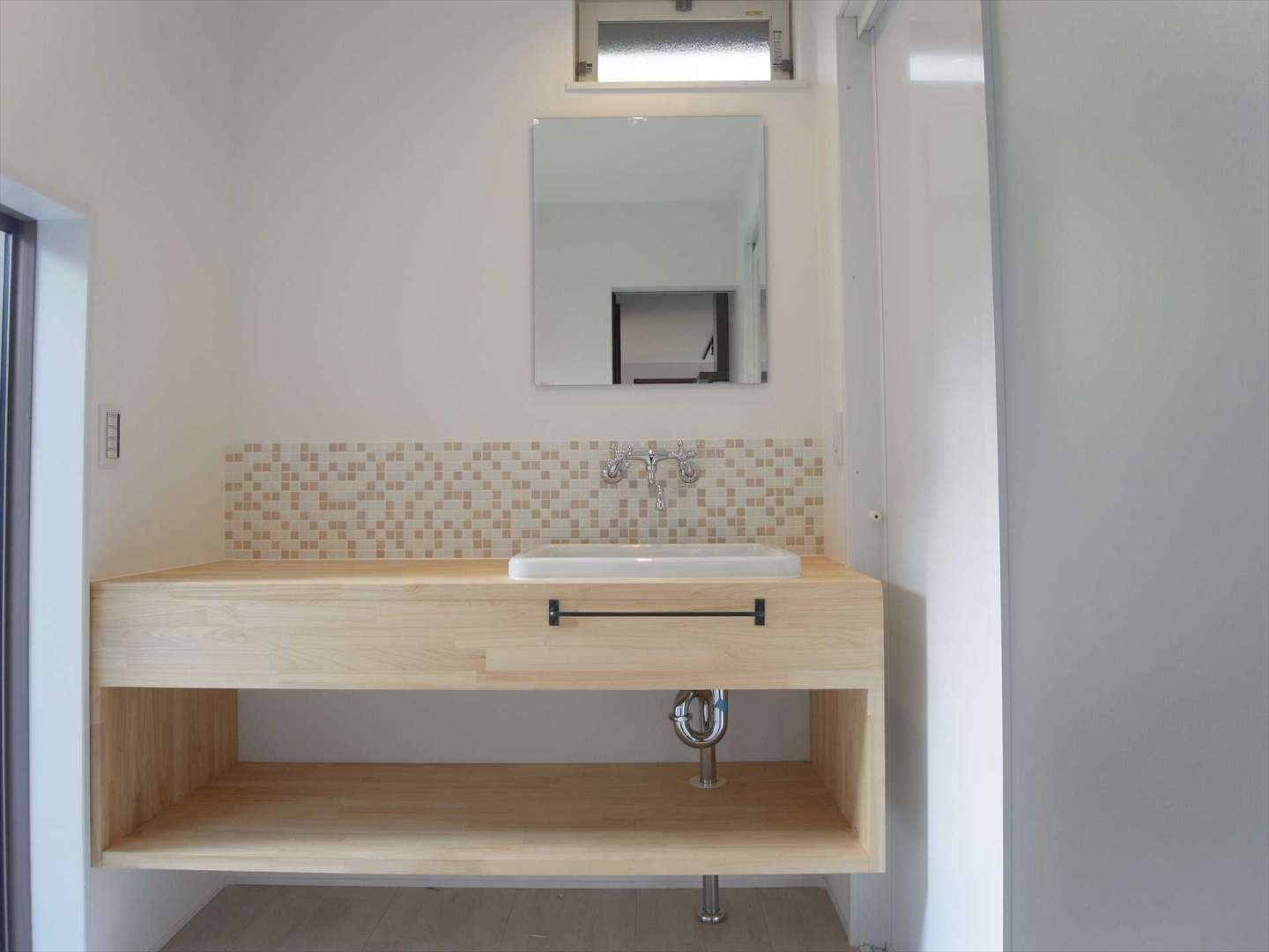 メルクシ材で化粧台を造作し背面には暖色カラーのモザイクタイルをお選びいただきました。