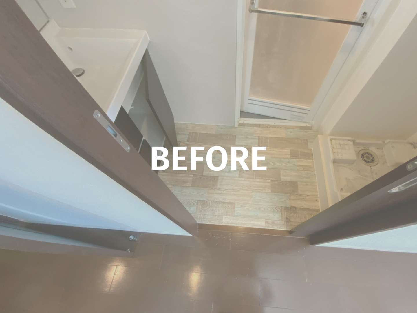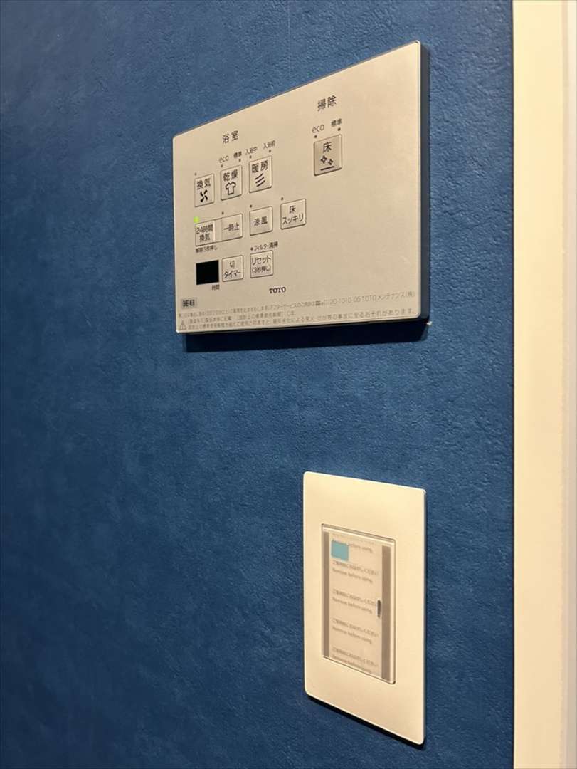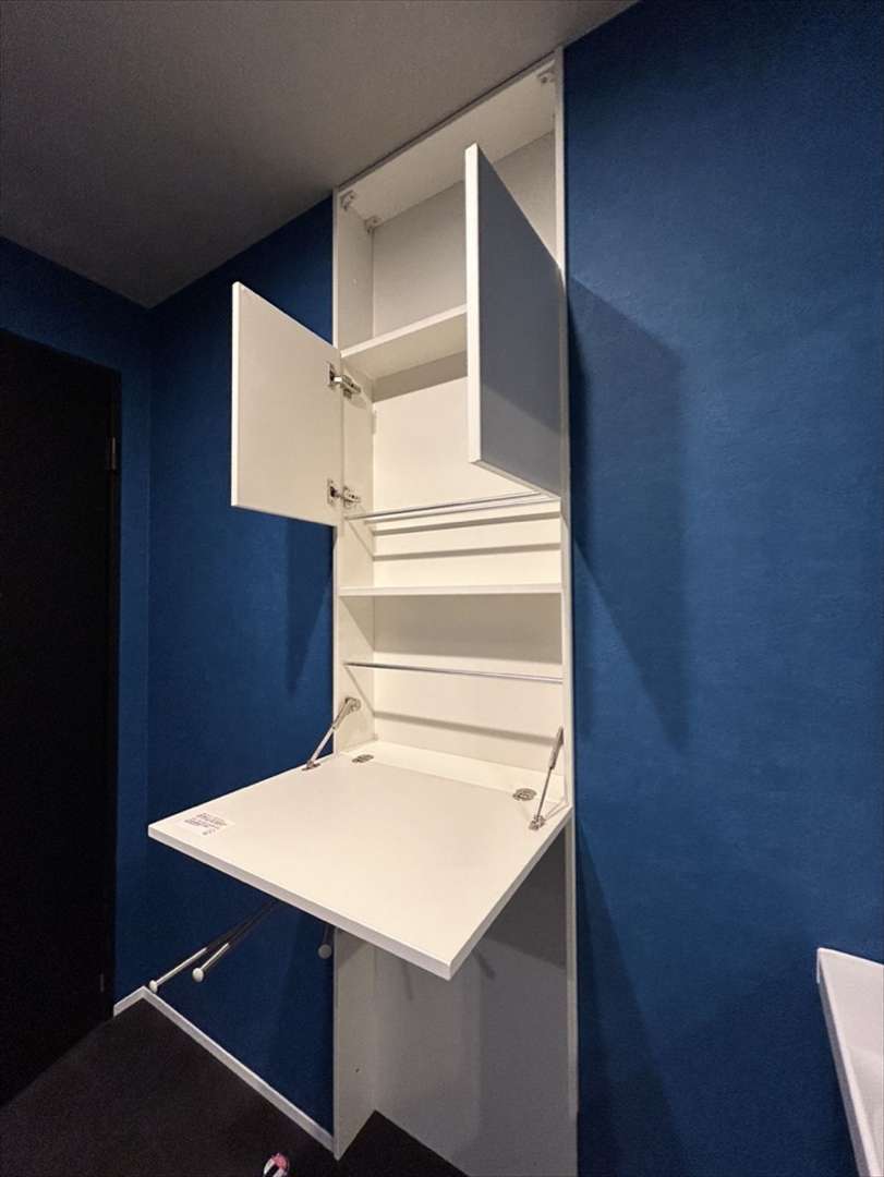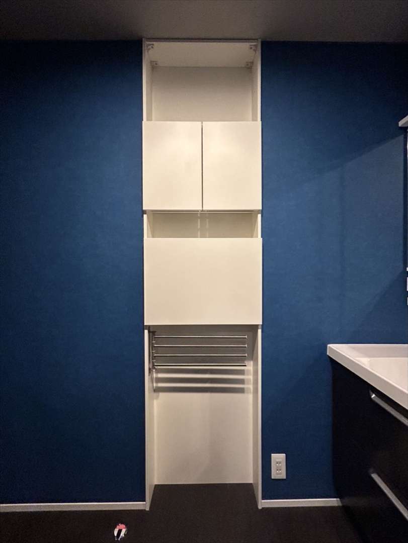 ミラーをフラットな一面鏡を選定し、サイドにニッチを造作して3段の棚を設けて収納をカバーしていま...
