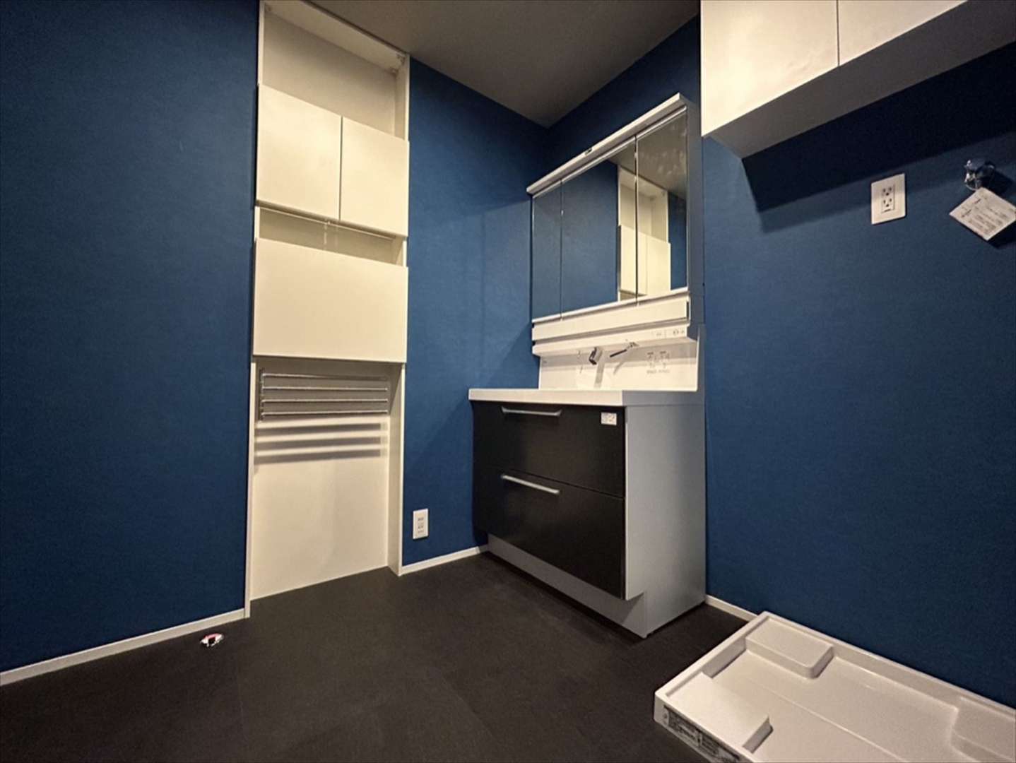 家具のような見栄えの洗面化粧台。天井・壁のクロスに雰囲気をつけることで、コンパクトながら存在感...