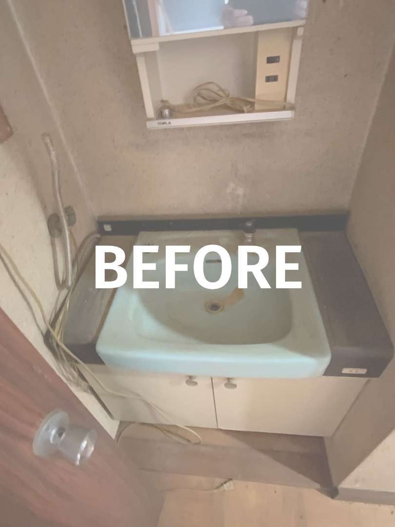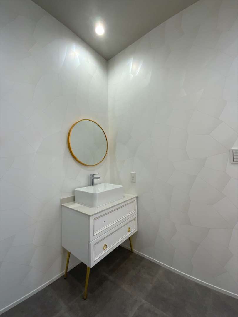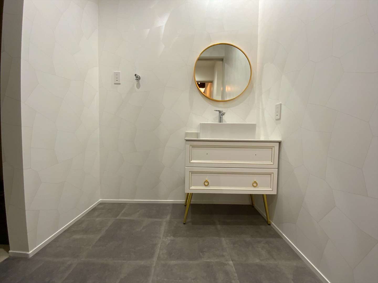 家具のような見栄えの洗面化粧台。天井・壁のクロスに雰囲気をつけることで、コンパクトながら存在感...