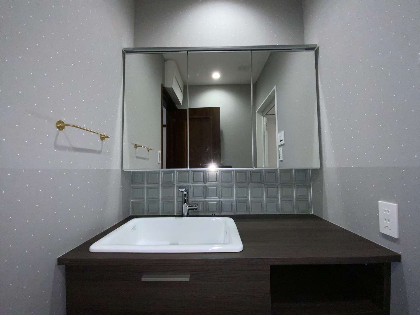 造作の洗面台で、すっきりとしたかっこいい印象に。カウンターはブラックの石目調、幕板部分や棚板は...