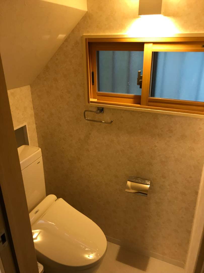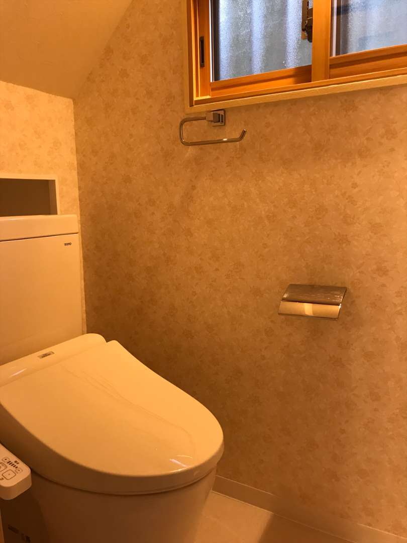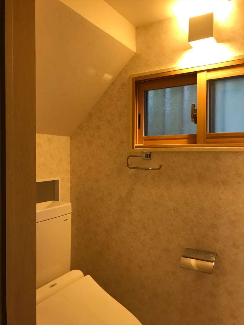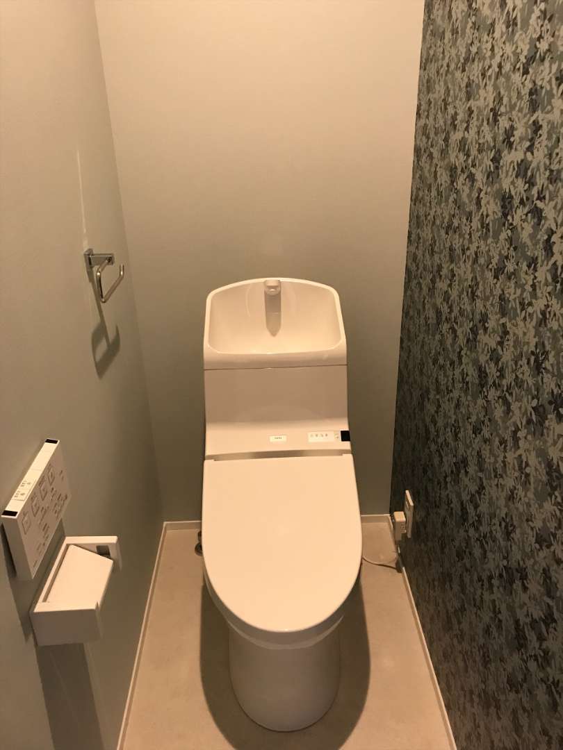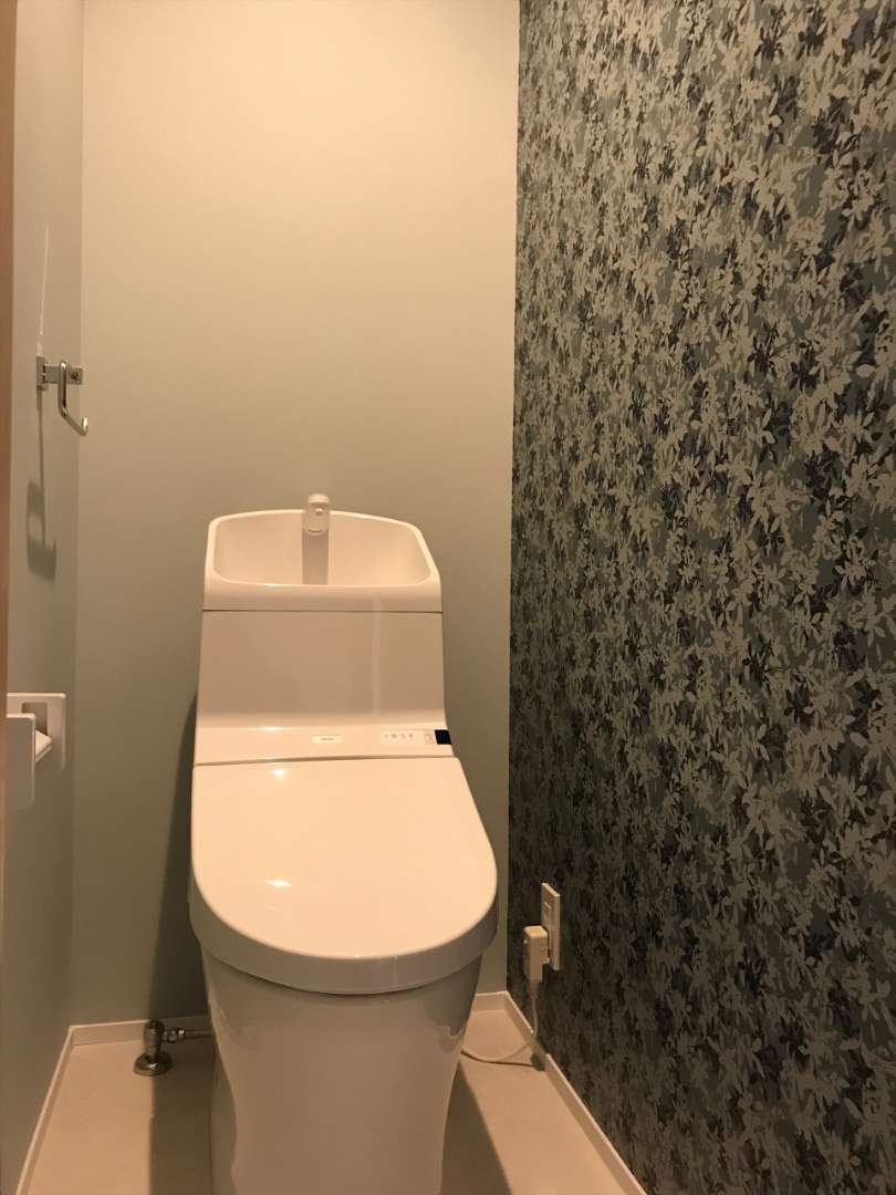 トイレの壁一面にデザイン性のあるクロスを採用することで、個性の際立つ雰囲気となりました。