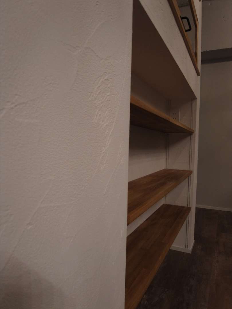 デッドスペースとなりがちな壁面にも収納スペースを設けることができました。