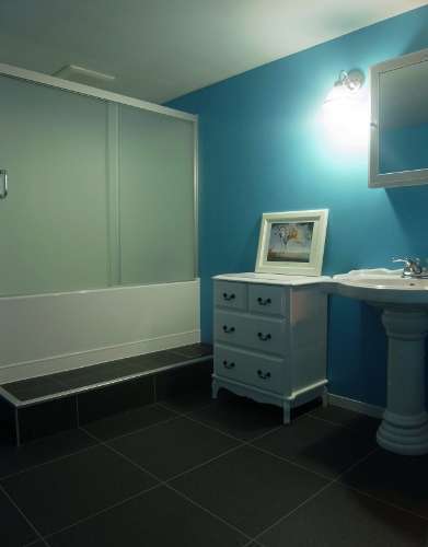 浴槽は日本製のものですが、レールなどは海外製を使用しバススライドドアを造作しました。