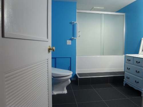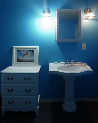 トイレ・洗面・ユニットバスと分かれていた空間を、1つの空間につなげブルー色で塗装しました。