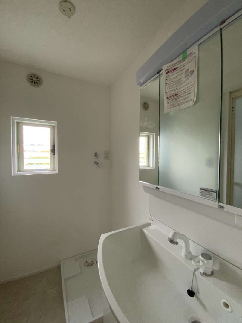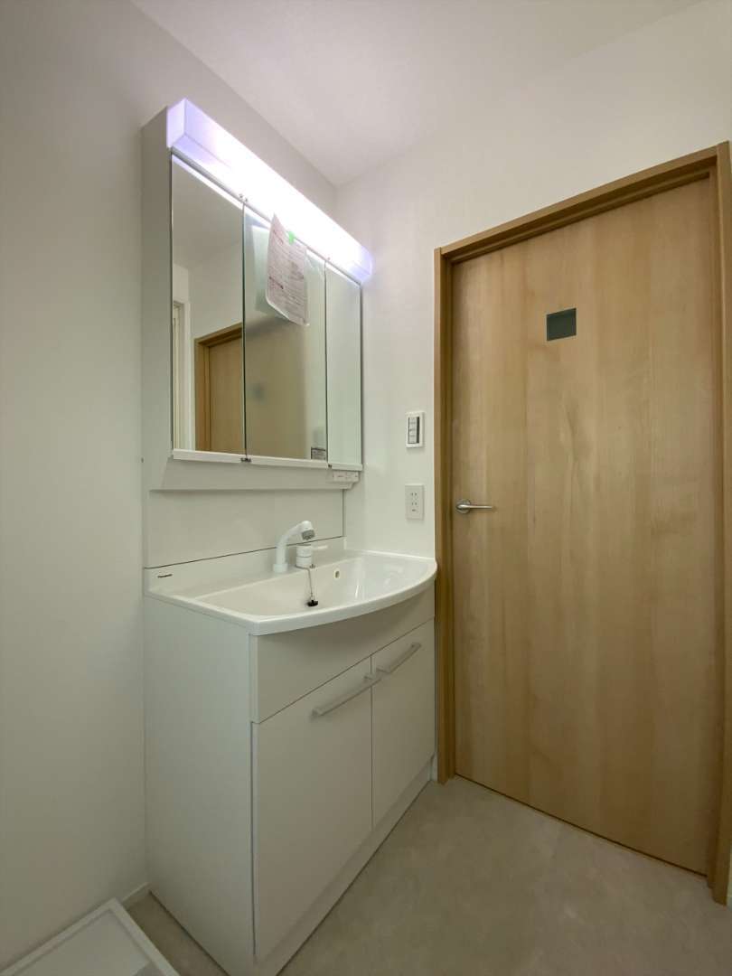 洗面室はもともと扉がなく、床の高さが通路と違うため扉を新設しました。