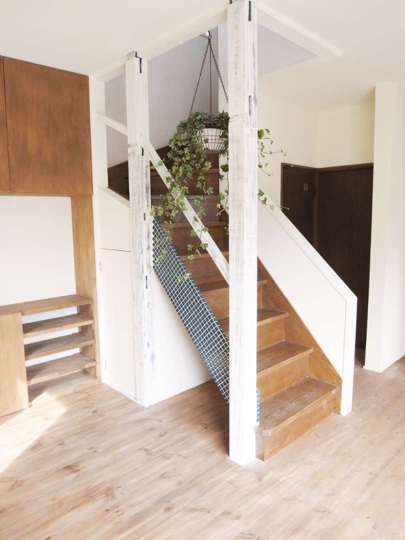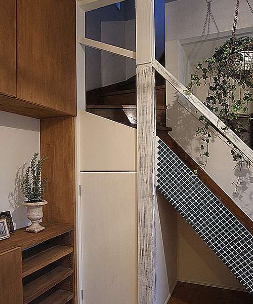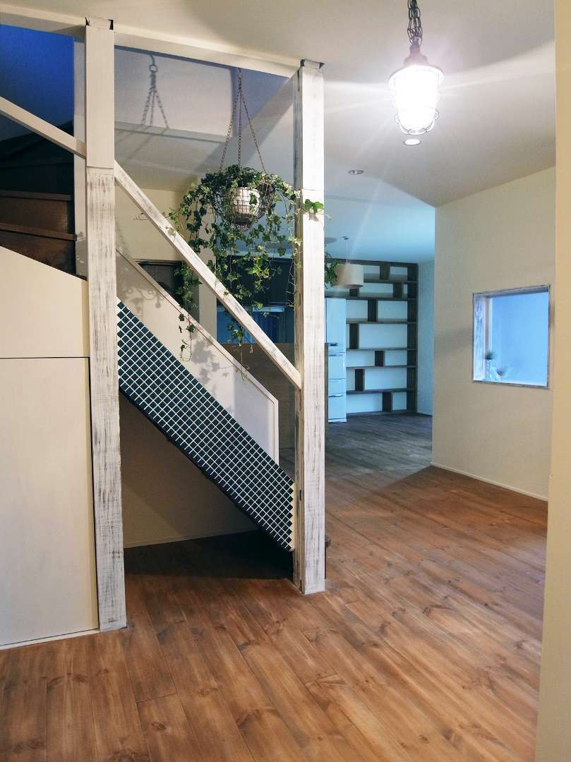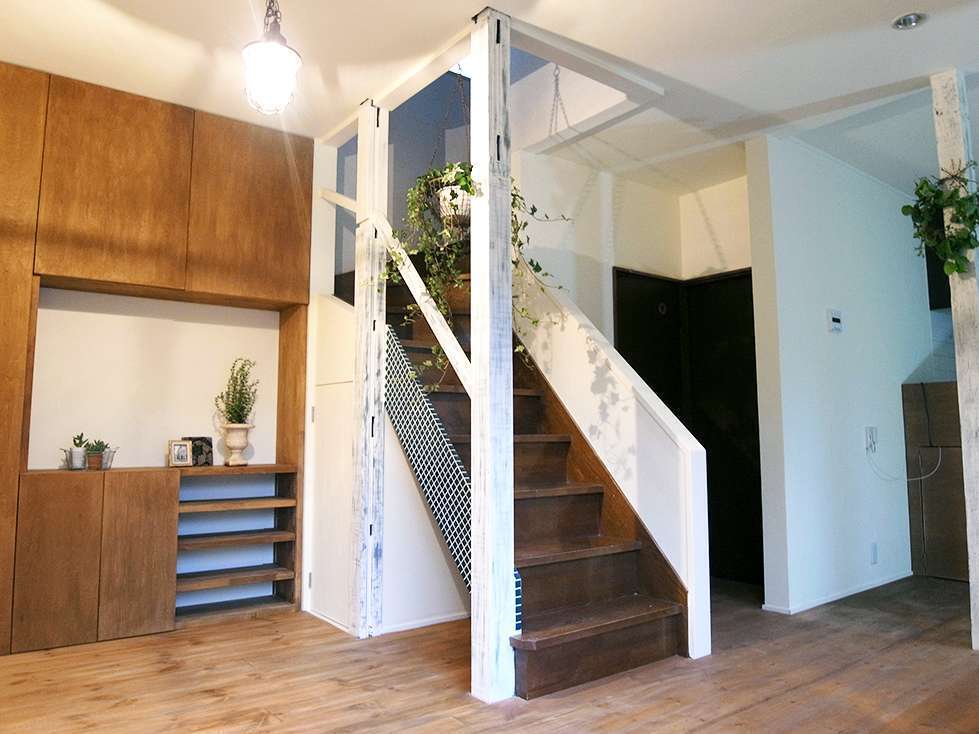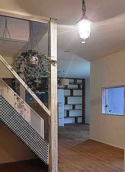 LDKの中間にある階段には一部解体による露出した柱にエイジング加工を施し、アンティーク感を演出。タイルがアクセントとなりフォーカスポイントとなっている。