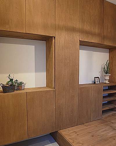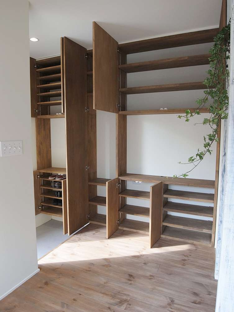 無垢の床材と造作家具は、全体の色味を統一することで空間に落ち着きと広さをプラス。