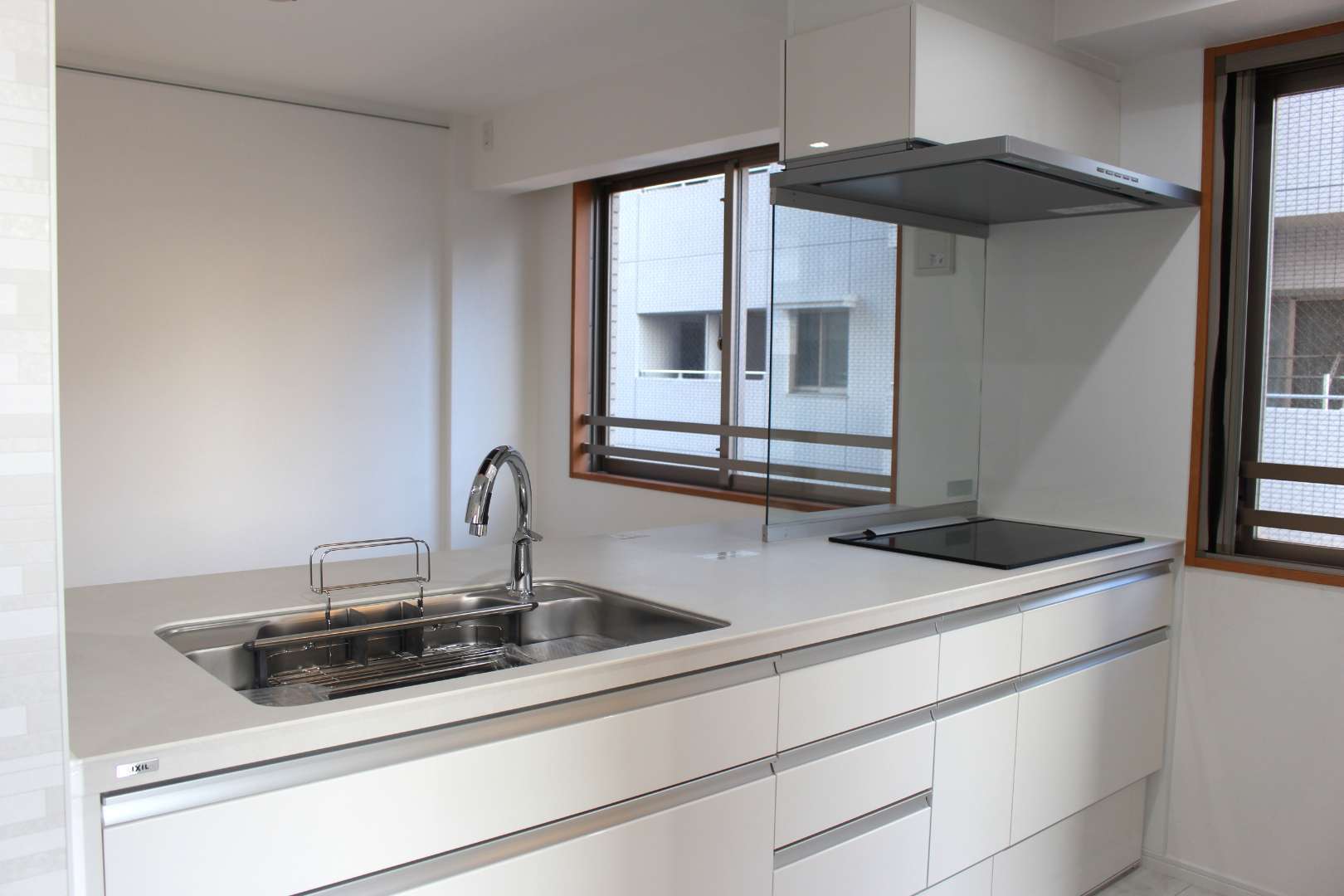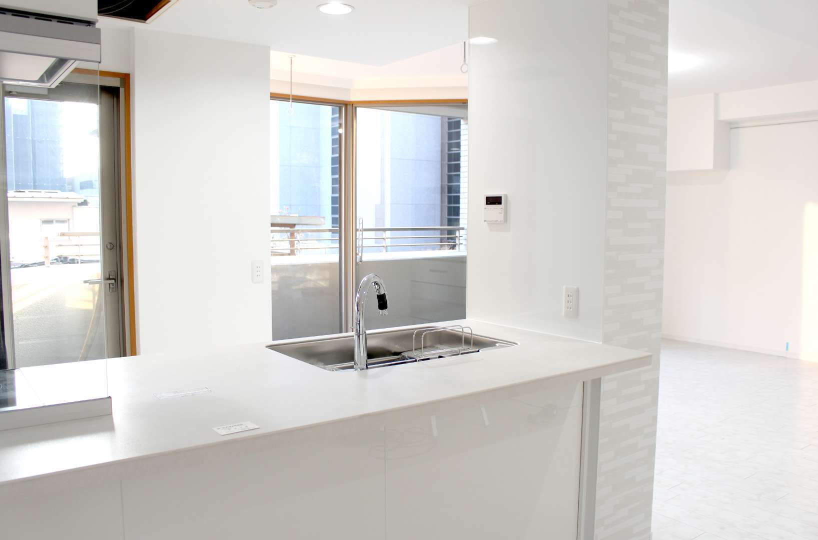 キッチンは間仕切りを撤去し、壁付(I型)のキッチンをアイランド型にする事でリビングと一体化しより一層リビングが広くなりました。