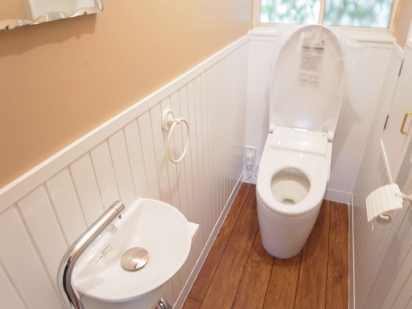 白い板貼りの腰壁と明るい茶系の壁紙が心地よい、ナチュラルカントリー風のトイレです。ペーパーホルダーやタオルかけも白で統一しました。