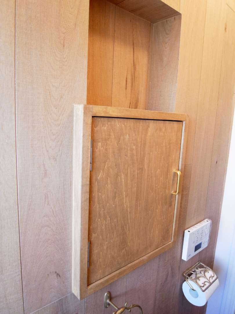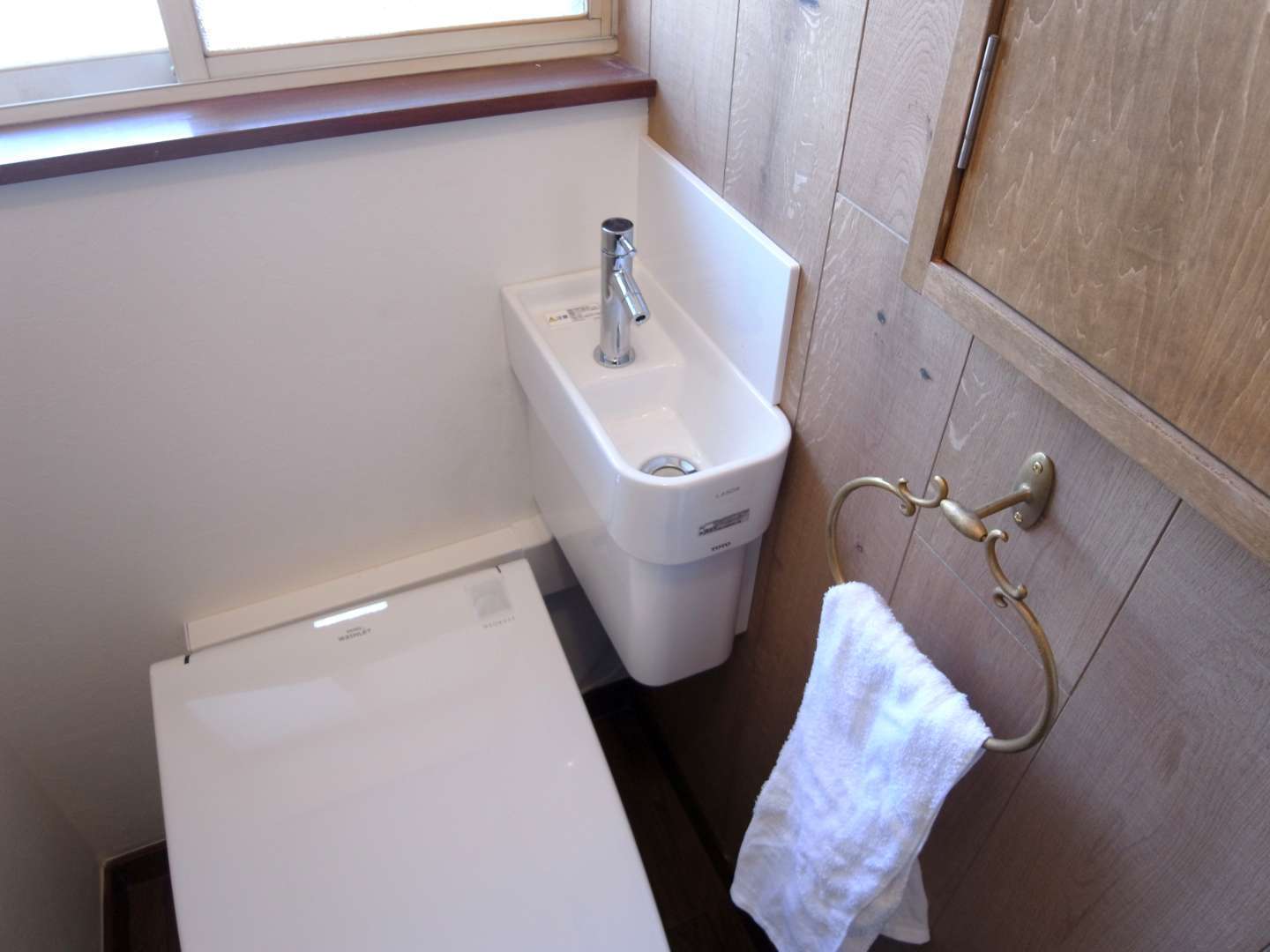 もう1箇所のトイレはグレイッシュな古材風の木の壁が印象的です。扉付きの棚にペーパーなどをしまうことができ、スッキリした印象をキープできます。狭さをクリアするために、ハイブリッドのタンクレストイレを選択しました。手洗い機能を保ちながら、背面の窓との干渉を避けることができました。