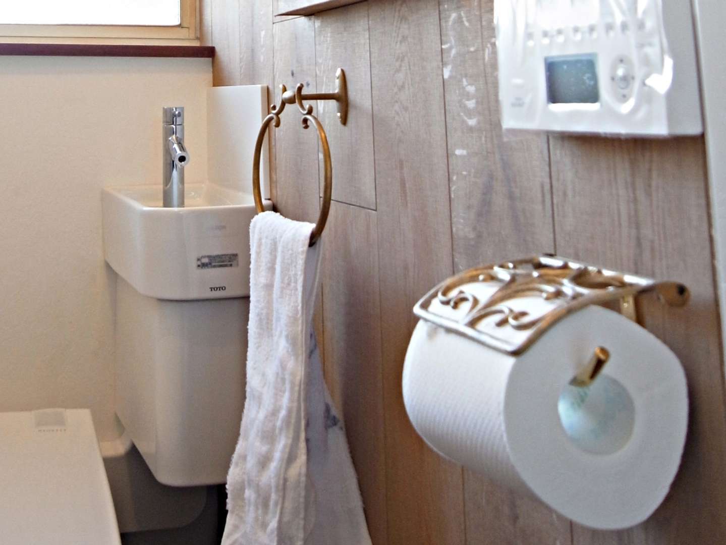 インテリアに合わせたタオルかけとペーパーホルダーは施主様のたってのご希望品です。