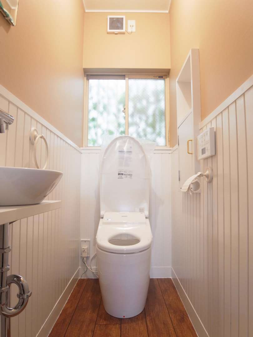 家に2箇所あるトイレと既存の浴室のリフォームをご希望でした。トイレは木の風合いを感じられるインテリアにしたいとのリクエストをいただきました。ドアもインテリアにあわせて、カントリー風のデザインを選びました。