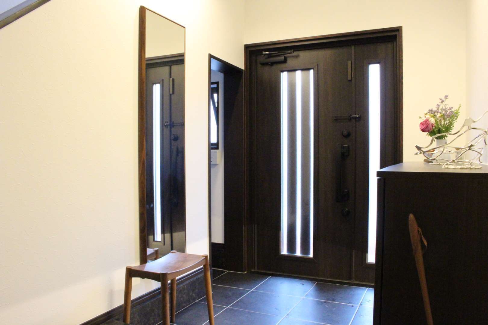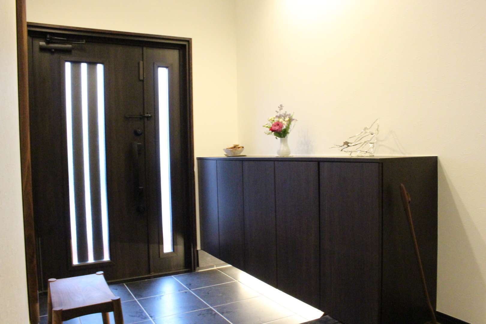 玄関は床のタイルを大判なものに貼り換えたことにより空間の広がりを感じられるようになりました。壁は全面無地の白をご選定いただいたので、あえて床や玄関収納を暗い色にしたことによりぐっと印象が引き締まり、落ち着いた雰囲気を演出することができます。