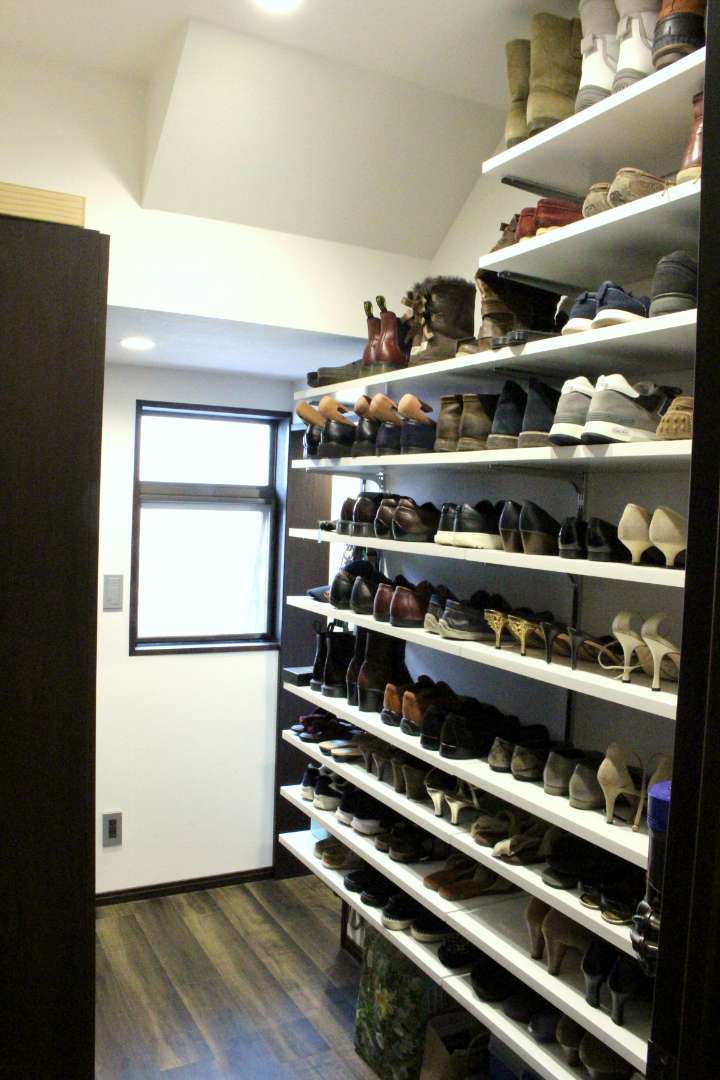 玄関からつながるシューズインクローゼットは、もともとは独立した納戸となっていました。玄関の壁を解体し直接SICへつながるようにしたことで、より使いやすく便利な動線とすることができました。オープンな可動棚に靴を収納し、左側の扉付きの玄関収納には傘や、コートなどを収納されているとのこと。SICがあるため玄関廻りに靴が散乱することなく、すっきりと使用していただくことができます。
