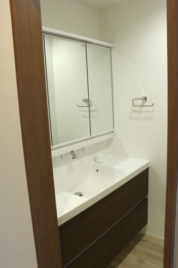 2Fにも洗面化粧台を設置することにより、朝の洗面室の混雑を軽減することができます。メインは1Fの洗面化粧台だったため2Fの化粧台はシンプルなものをご選定いただきました。