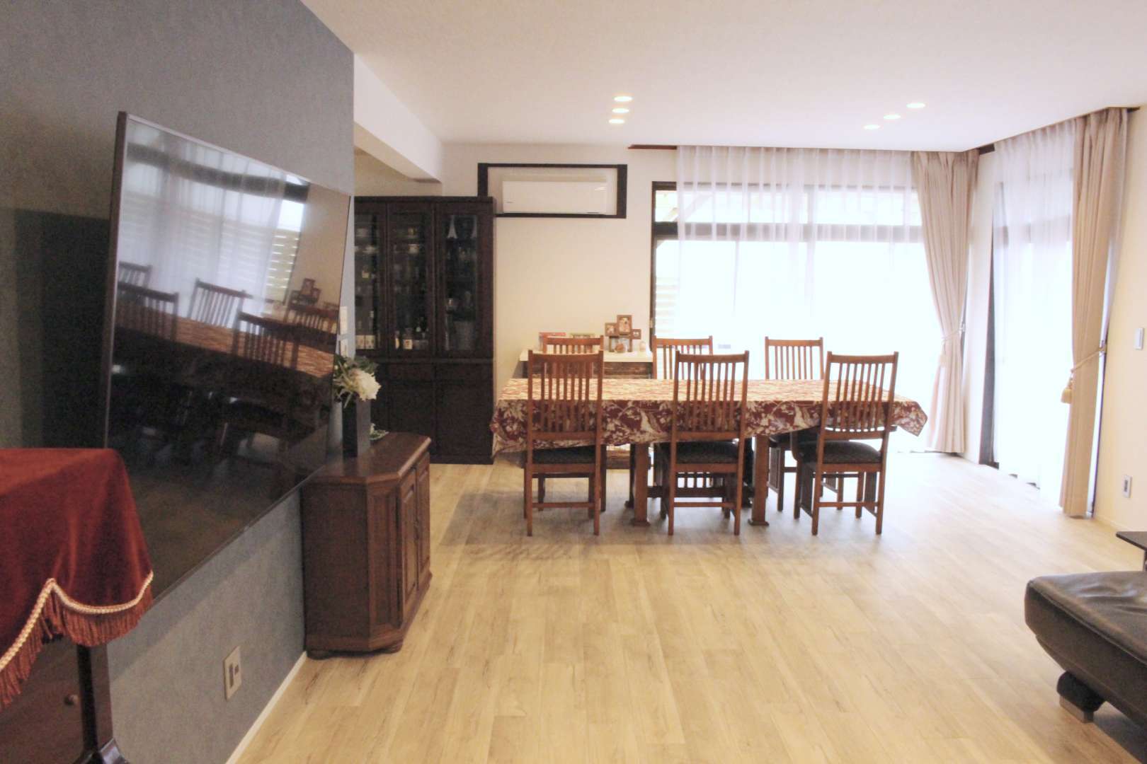 リフォームを始める前からとても大きく立派なソファ、こちらが最初から決まっていました。ソファに似合うリビングを、とプランニングを進めさせていただくことに。リビングとダイニングを仕切っていた壁やドアを撤去し、広々とした解放感あふれる空間へと生まれ変わりました。ソファの向かい側には壁掛けテレビを設置し、アクセントクロスとしてネイビーをご選定いただきました。
