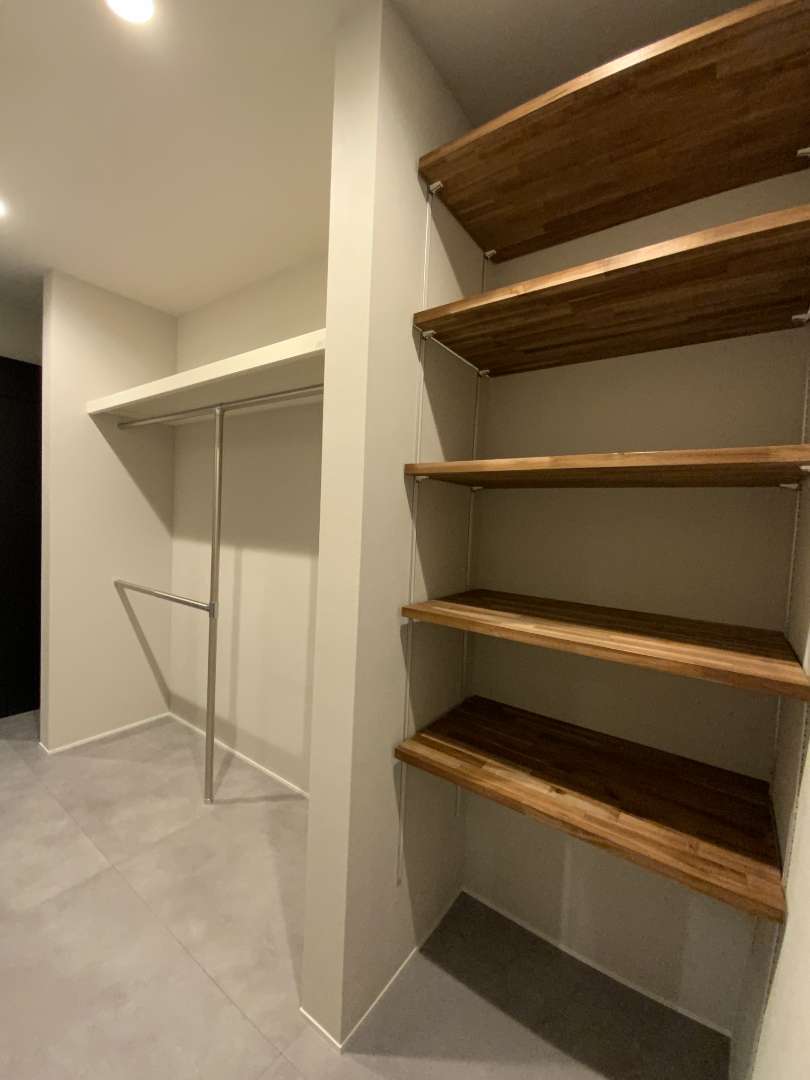 当初動線計画のプラン中、お二人とも仕事をしていたり、既存2Fの3部屋を残して検討していたりで、用途目的が少ない部屋などがあったりしていました。検討を重ねる中で、1Fは通常のLDKに回廊型で玄関からのアクセスできるWTC(ウォークスルークロゼット)を隣接し、食事後や家事や外出や帰宅の際の「動」のLDとして、また2Fはベッドルームや書斎と隣接した「静」のLDとして配置することになりました。この2つのメインルームは仕上材や照明などがまったく違うので、それぞれ別のくつろぎの空間となります。